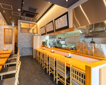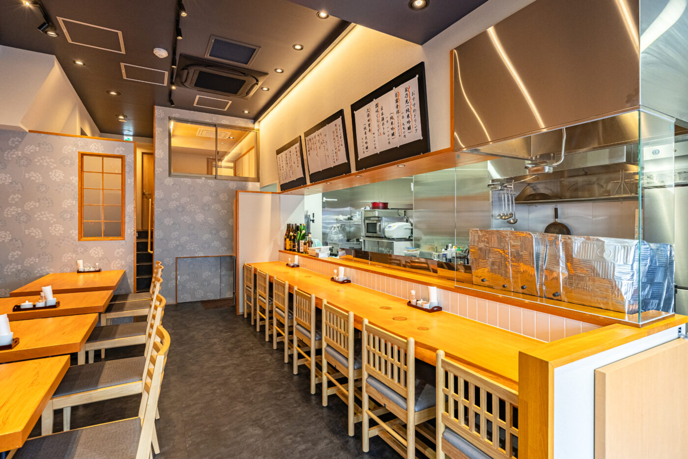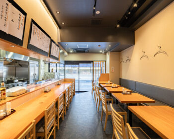 こだわりは、既存店で長年愛されてきた銘木カウンター・座敷テーブルをリメイクした