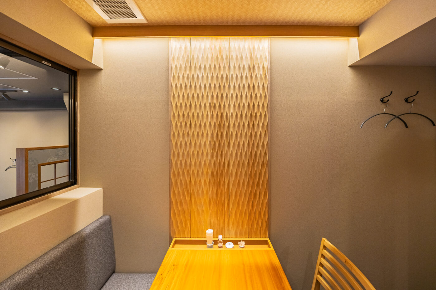 こだわりは、既存店で長年愛されてきた銘木カウンター・座敷テーブルをリメイクした